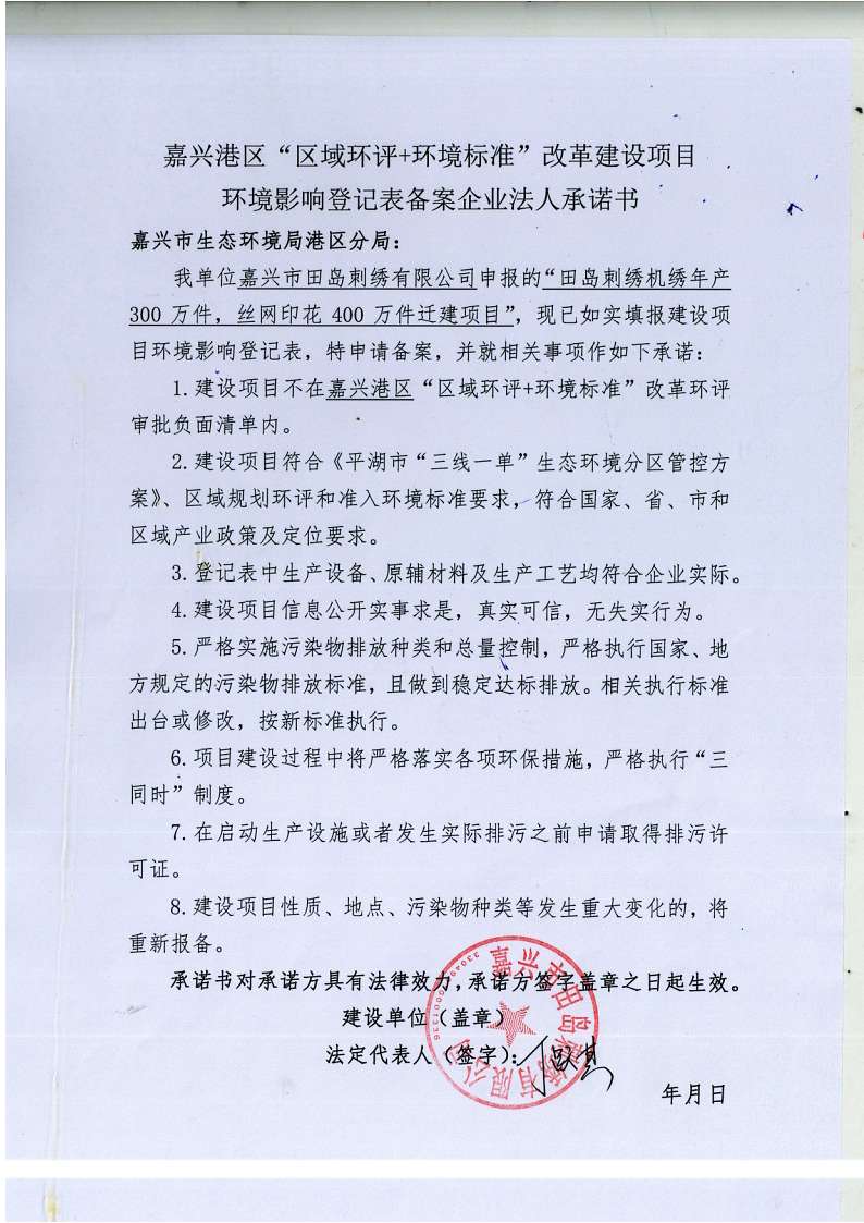 關于田島刺繡機繡年產 300 萬件,絲網印花 400 萬件遷建項目環境影響登記表備案法人承諾書公示